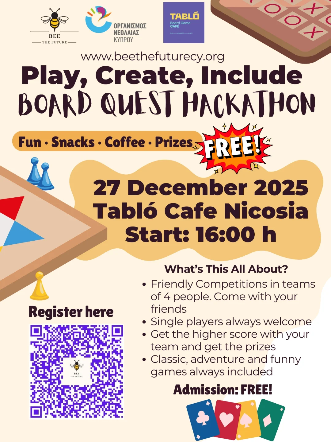 🎲 BOARD QUEST HACKATHON – Play, Create, Include 🎲 On 27 December 2025, we successfully organized BOARD QUEST HACKATHON at Tablo Cafe in Nicosia, bringing young people together through play, teamwork, and friendly competition. The…